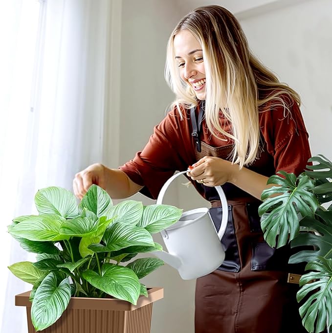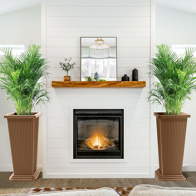 FENCY Set of 2 Tall Planters for Outdoor Plants, 24 Inch Large Tapered Pots with Drainage Trays, Weather-Resistant Plastic Plant Containers for Patio, Porch, Garden, Front Door Decor,Brown, Striped