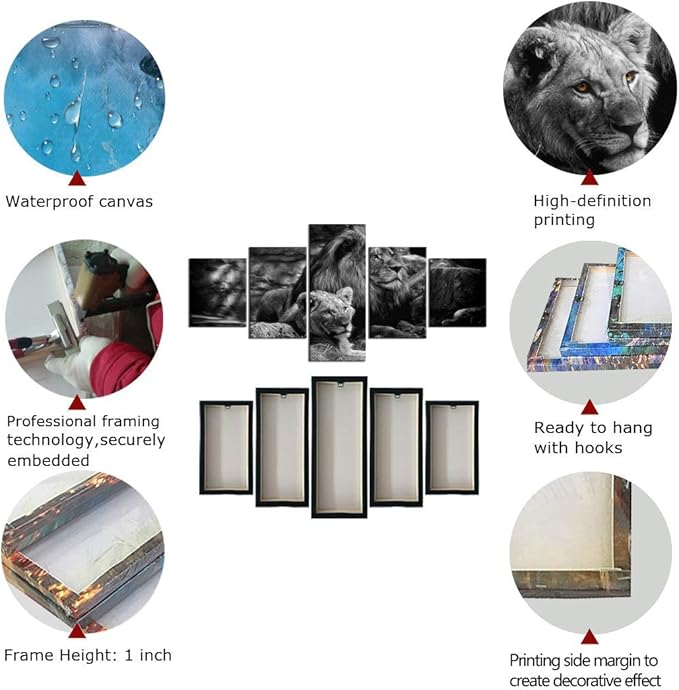 Yatsen Bridge 5 Piece Lion Picture Wall Decor Black and White Lion and Lioness Picture Printed on Canvas Modern Gallery-Wrapped Lion Painting Ready to Hang for Home and Office Decor - 50''W x 24''H