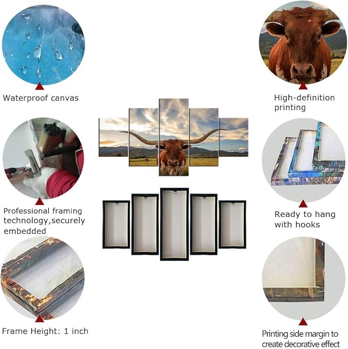 5 Piece Animal HD Painting Canvas Prints Texas Longhorn Steer in Rural Utah Giclee Artwork Modern Framed and Stretched Wall Art Painting for Living Room Decor - 60''W x 32''H