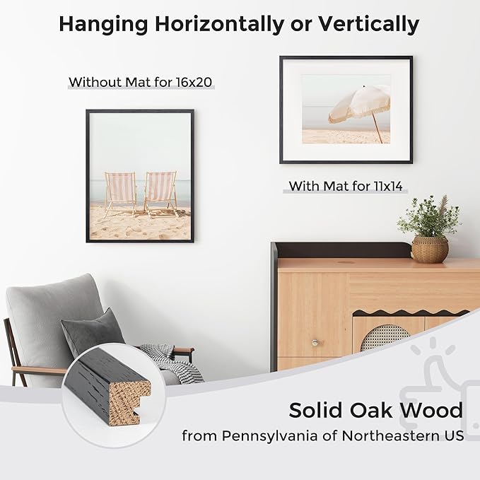 Axeman 16x20 Picture Frame with Mat for 11x14, Solid Oak Wood Poster Frame with Tempered Glass for Home Decor, Wooden 16x20inch Photo Frame for Art Photo and Prints, Wall Hook Included, Black