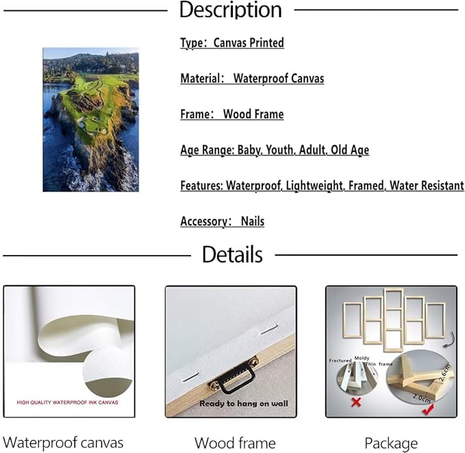 Pebble Beach Golf Course Canvas Wall Art for Living Room Bedroom Bathroom Home Decorations Sports Landscape Office Room Decor Golf Framed Artwork Giclee Prints Ready to Hang(12''W x 18''H)