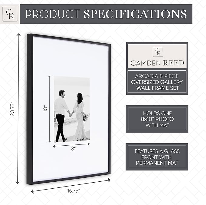 Camden Reed Arcadia 8 Piece Oversized Gallery Wall Frame, 16x20 and 16x16 Inch Matted Frames for Featuring 8x10 and 5x7 Inch Photographs or Art Prints, Black Finish