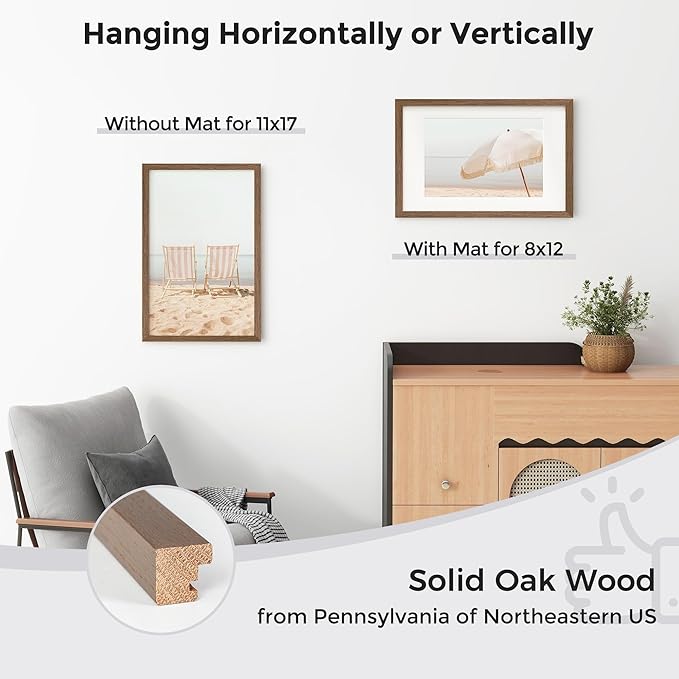 Axeman 11x17 Picture Frame with Mat for 8x12, Solid Oak Wood Poster Frame with Tempered Glass, Natural Wooden 11''x17'' Photo Frame for Wall Home Decor Art Photo and Prints with Wall Hooks, Walnut