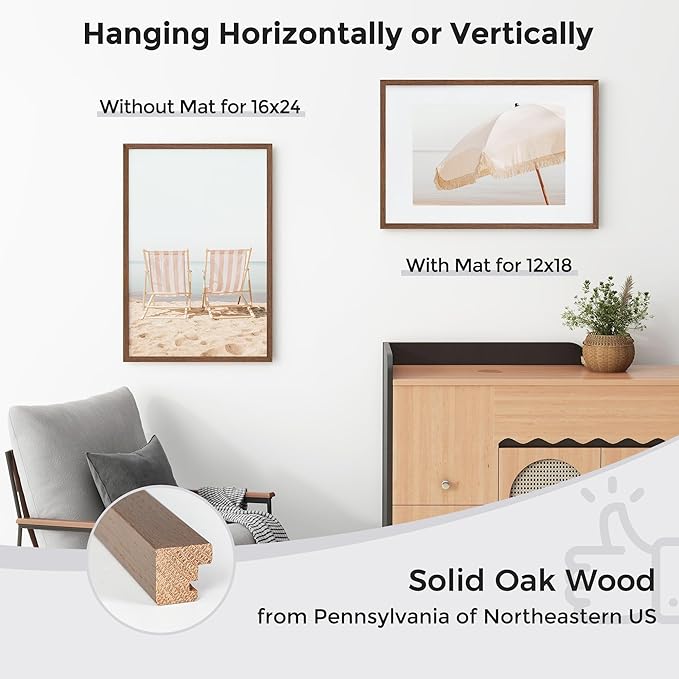 Axeman 16x24 Frame With Mat for 12x18, Solid Oak Wood 16x24 Poster Frame With Tempered Glass, 16 x 24 Picture Frame for Wall, 16 by 24 Wood Frame Home Decor, Hanging Hardware included, 2 PCs, Walnut
