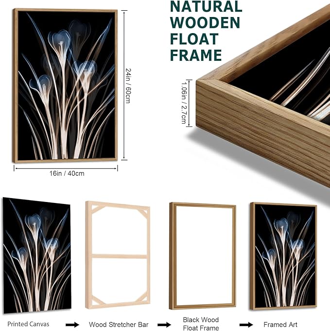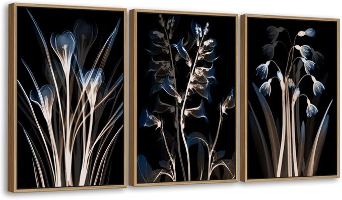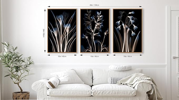 Large Modern Framed Wall Art - Natural Float Framed Blue Brown Flowers Black Canvas Pictures Decor Abstract Botanical Artwork for Living Room Bedroom Kitchen Home Office Decoration 48" X 24" Set of 3