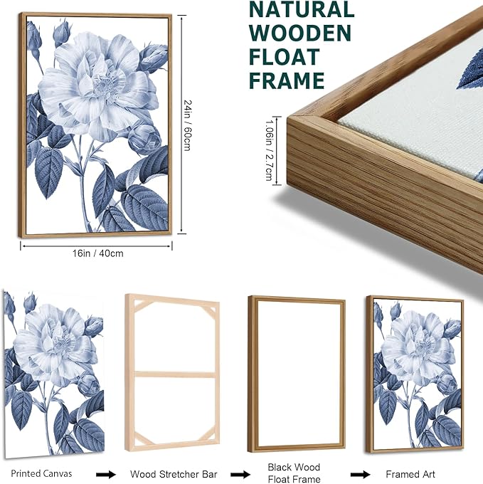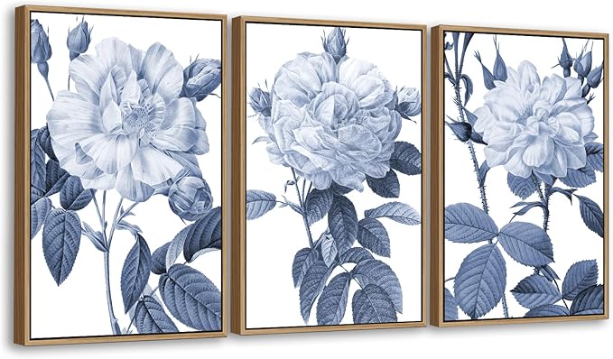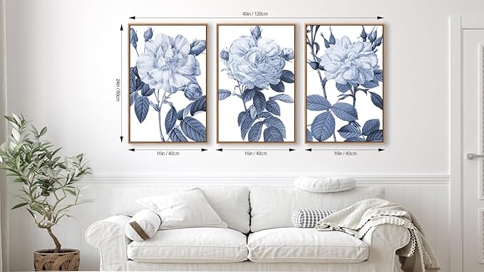Large Framed Canvas Wall Art - Natural Float Framed Blue Gray Flowers Pictures Decor Rustic Blossom Leaves Botanical Artwork for Living Room Bedroom Kitchen Home Office Decoration 48" X 24" Set of 3