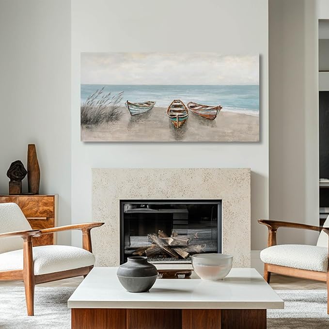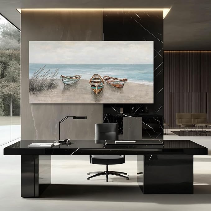 WINKAILIN Large Landscape Wall Art Blue Ocean Pictures Wall Decor Wooden Boat Painting Artwork for Walls Living room Office Home Decoration 29x58 Inch