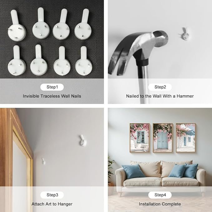 HOURIA Greek Island Street Framed Canvas Wall Art Set,Santorini Blue Doors Shutters Wall Decor,Coastal White House Pink Flower Artwork,European Cityscape Art Prints for Living Room, Bedroom-24 x36 x3