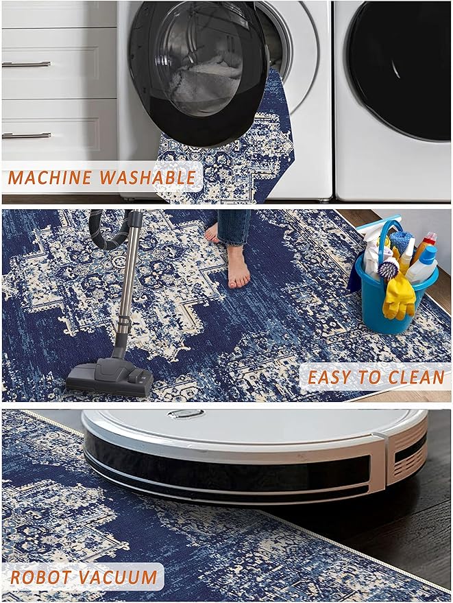 vivorug 3x5 Rug, Small Area Rug for Living Room, Bedroom, Kitchen, Machine Washable Non-Slip Throw Rug, Vintage Carpet for Entryway Nursery Coffee Table - Durable (Navy Blue)