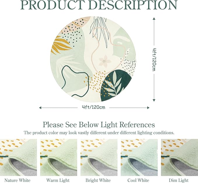 Lahome Boho Round Rugs - 4Ft Washable Non-Slip Small Round Area Rug Throw Soft Cute Round Nursery Rug Non-Shed Lightweight Bathroom Rug, Green Botanical Print Circle Rug for Bedroom Dorm Kids Room