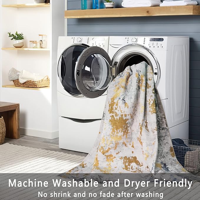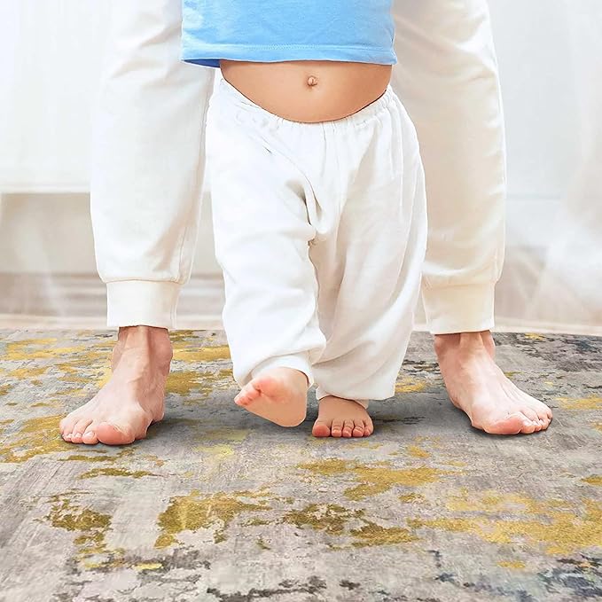 vivorug Round Rug 4ft Abstract Round Area Rug Non-Slip Indoor Carpet for Living Room Bedroom Entryway, Stain Resistant Home Decor Circle Rug, Grey/Mustard