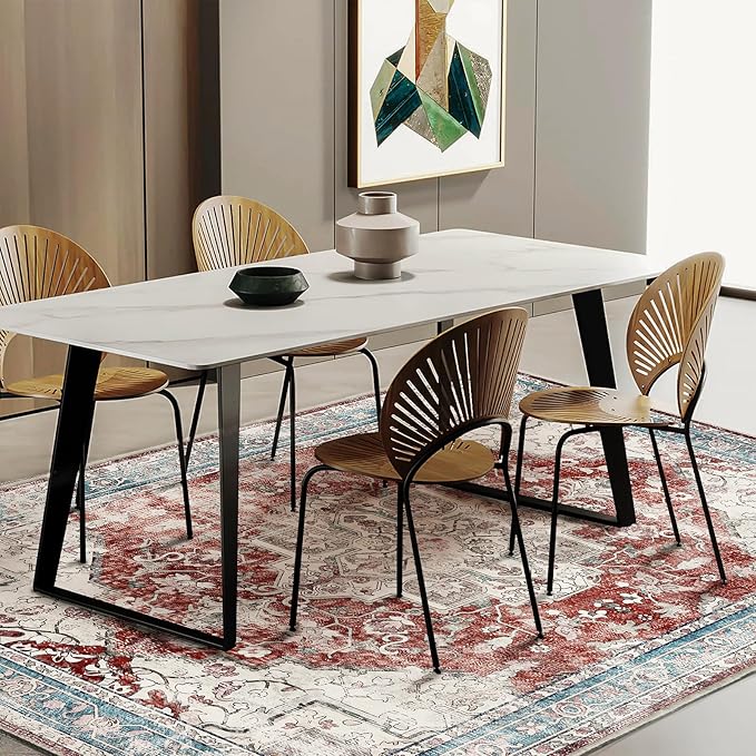 Washable Area Rug 8'x10' Red Blue Retro Boho Design Non-Shedding Non-Slip Easy Care Ideal for High Traffic Areas in Living Room Bedroom Office Coffee Table Kitchen Large Carpet