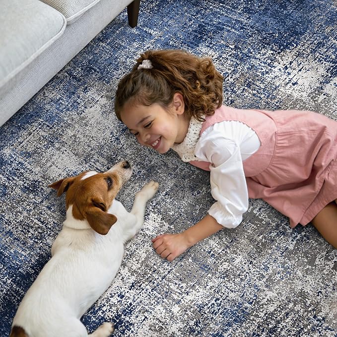 GENIMO Washable Area Rugs for Living Room Bedroom, 8x10 Modern Abstract Non Slip Rug, Low Pile Soft Contemporary Indoor Floor Carpet Cover for Dining Room Kitchen, Blue&Gray