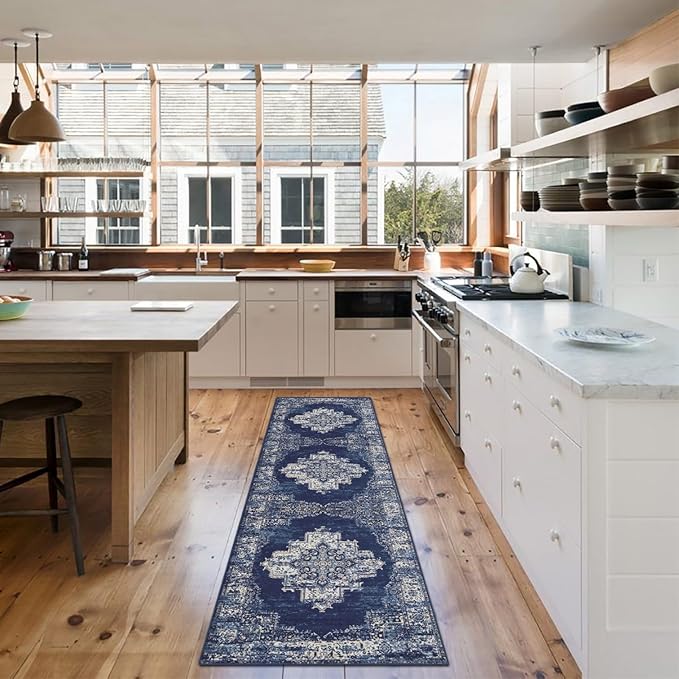 vivorug Runner Rug 2x10 Machine Washable Rug with Non-Slip Backing, Ideal for Kitchen Hallway Entryway Laundry Room - Vintage-Inspired, Durable, Easy Clean, Low Pile Carpet Runner, Navy Blue