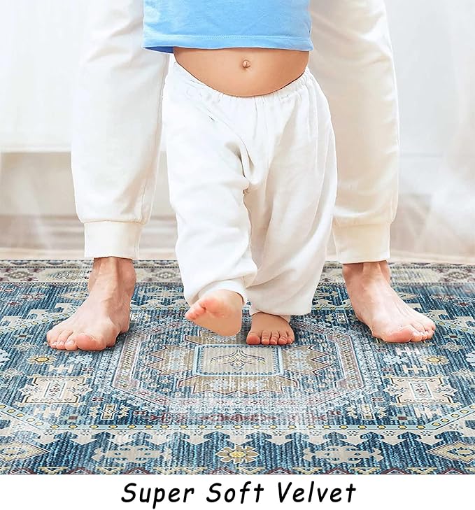 vivorug 9x12 Area Rugs for Living Room, Non Slip Machine Washable Vintage Rug, Ultra-Thin Lightweight Large Area Rug for Bedroom, Dining Room, Low Pile Blue