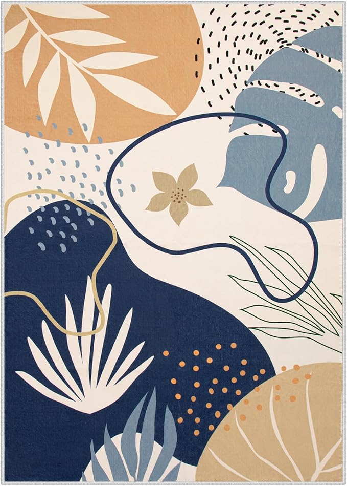 Lahome Washable Area Rug - 8x10 Non-Slip Ultra-Thin Large Area Rug, Soft Bedroom & Living Room Rug, Boho Botanical Print Indoor Stain Resistant Floor Rug for Dining Room Table & Office