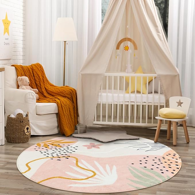 Lahome Pink Round Rugs 8Ft - Washable Boho Area Rug for Living Room Non-Slip Soft Ultra-Thin Large Round Rug Dining Room Rug, Botanical Print Floor Round Carpet for Bedroom Office Dorm (Pink, 8'x8')