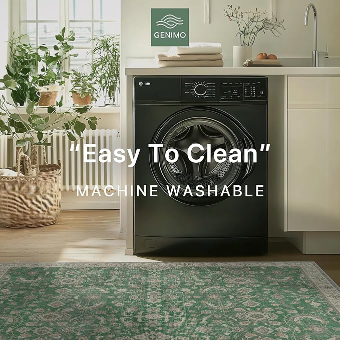 GENIMO Washable Area Rugs for Living Room Bedroom, 8x10 Boho Vintage Non Slip Rug, Low Pile Soft Floral Indoor Floor Carpet Cover for Dining Room Kitchen, Khaki Green