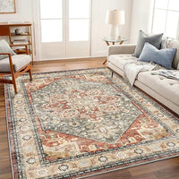 Area Rug 6'x9' Red Khaki Washable Vintage Traditional Floor Cover Thin Retro Kitchen Indoor Distressed Non Slip Carpet Floral Area for Living Room Bedroom Dining Room