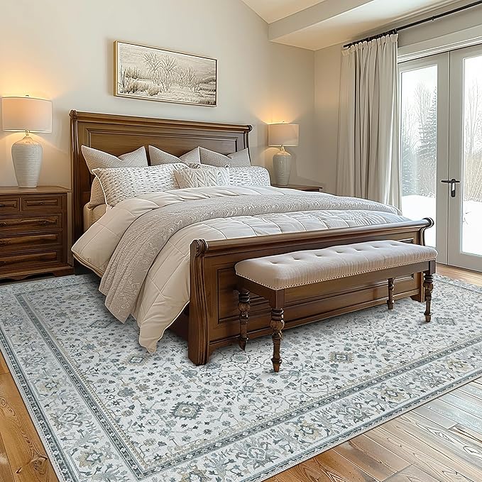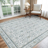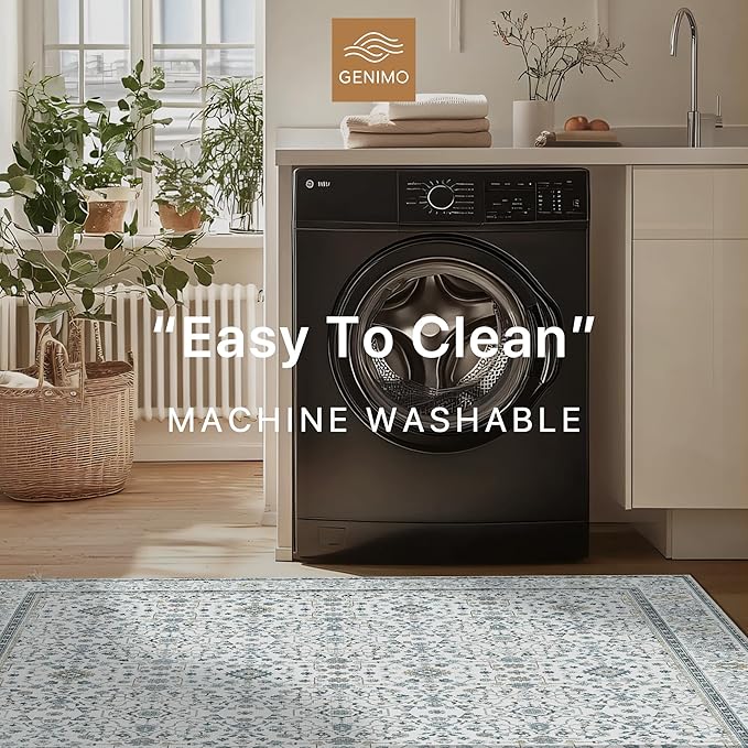 GENIMO Washable Area Rugs for Living Room Bedroom, 8x10 Boho Vintage Non Slip Rug, Low Pile Soft Floral Indoor Floor Carpet Cover for Dining Room Kitchen, Retro Gray Blue