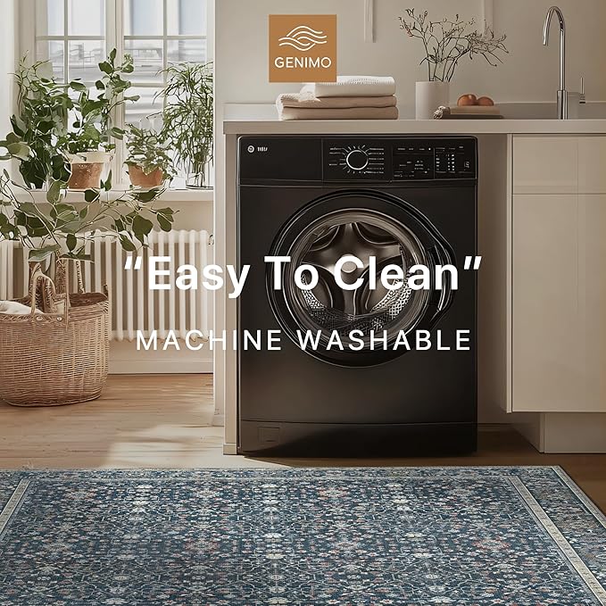 GENIMO Washable Area Rugs for Living Room Bedroom, 6x9 Boho Vintage Non Slip Rug, Low Pile Soft Floral Indoor Floor Carpet Cover for Dining Room Kitchen, Retro Dark Blue