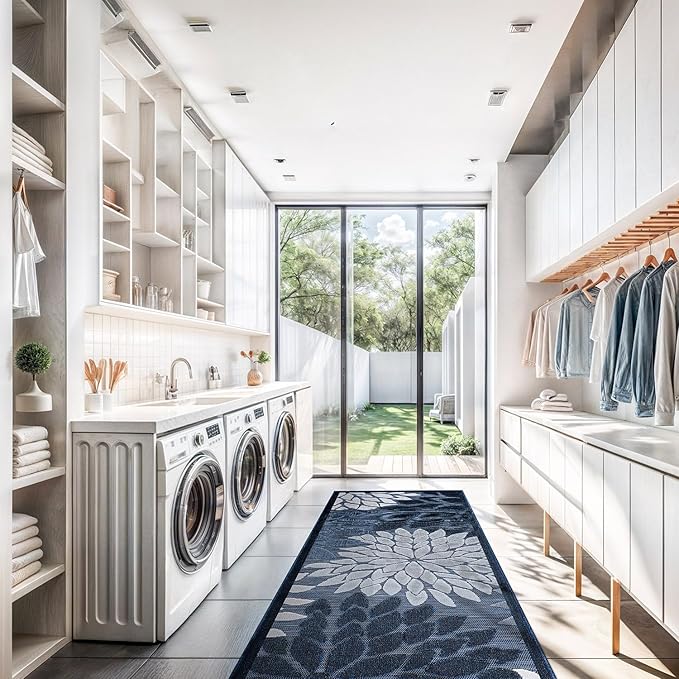 Beverly Rug Outdoor Runner Rug 2x7 Modern Floral Tropical Area Rugs for Indoor and Outdoor Patio Easy to Clean Non Shedding Living Room Porch Garden Washable Outside Carpet (2 x 7 Navy Blue)