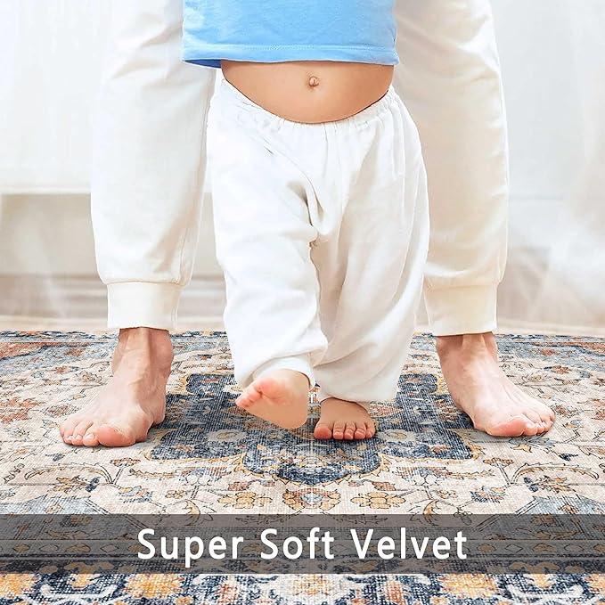 vivorug 5x7 Area Rugs - Boho Ultra-Thin Washable Rug with Non-Slip Backing, Ideal for Living Room, Bedroom, Kitchen Floor Carpet - Vintage Floral, Easy Clean, Durable, Low Pile Orange/Navy