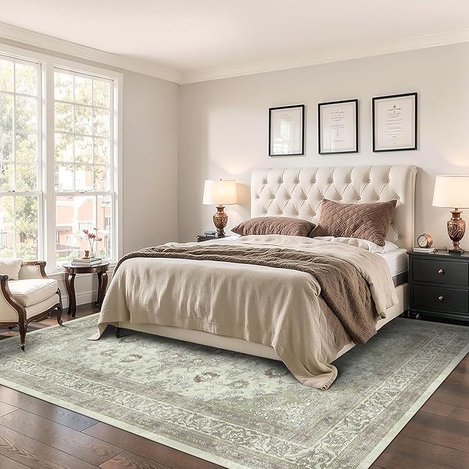 vivorug Sage Green 5x7 Area Rugs - Ultra-Thin Washable Rug with Non-Slip Backing, Ideal for Living Room, Bedroom, Kitchen Floor Carpet - Vintage Floral, Easy Clean, Durable, Low Pile