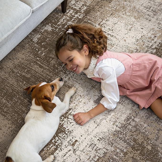 GENIMO Washable Area Rugs for Living Room Bedroom, 10x14 Modern Abstract Non Slip Rug, Low Pile Soft Contemporary Indoor Floor Carpet Cover for Dinning Room Kitchen, Earthy Brown
