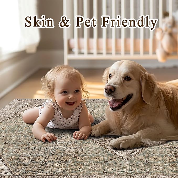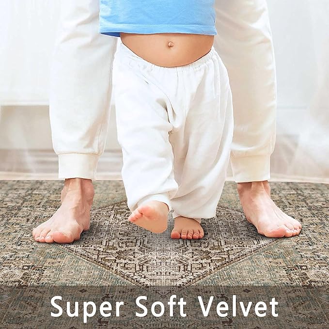 vivorug 5x7 Area Rugs - Ultra-Thin Washable Rug with Non-Slip Backing, Ideal for Living Room, Bedroom, Kitchen Floor Carpet - Vintage, Easy Clean, Durable, Turquoise/Antique
