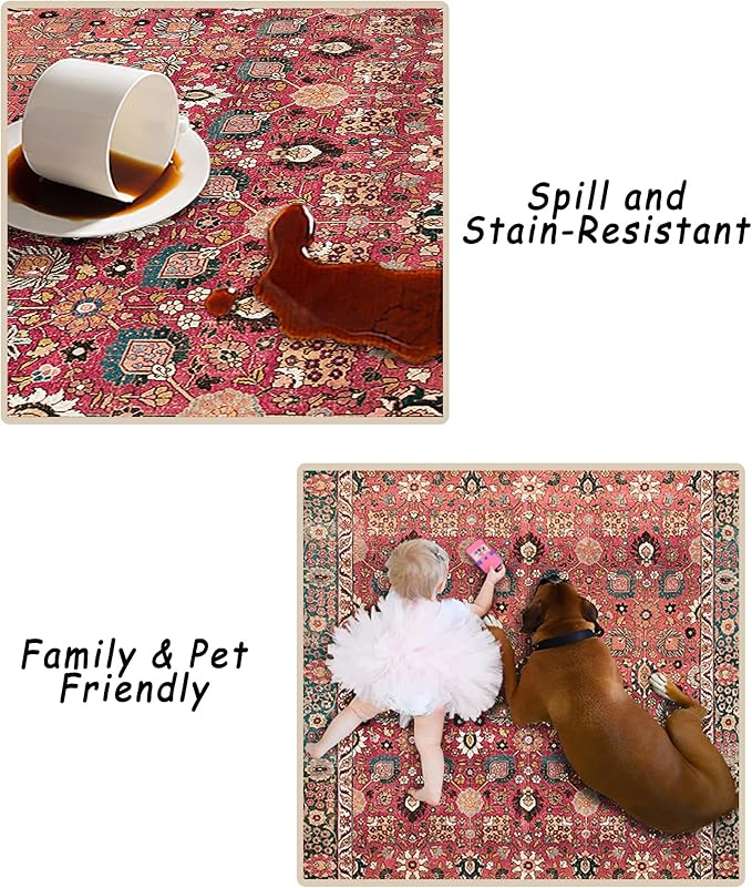 vivorug Round Rug 5ft Vintage Round Area Rug Non-Slip Indoor Carpet for Living Room Bedroom Entryway, Stain Resistant Home Decor Circle Rug, Cherry Red/Spice