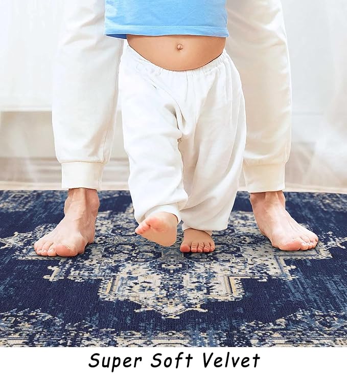 vivorug Round Rug 5ft Vintage Round Area Rug Non-Slip Indoor Carpet for Living Room Bedroom Entryway, Stain Resistant Home Decor Circle Rug, Navy Blue