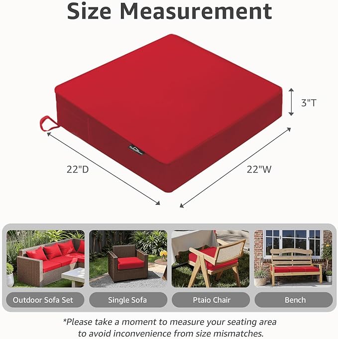 Outdoor Chair Cushions 22 x 22 x 3 Inch, Waterproof & Fade Resistant Patio Seat Cushion for Furniture with Handle and Ties, Thick Seating Pads for Outside Sofa Couch Set of 2, Red