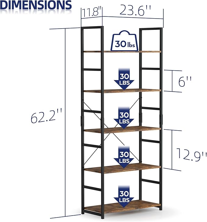 NUMENN 5 Tier Bookshelf, Tall Bookcase Shelf Storage Organizer, Modern Book Shelf for Bedroom, Living Room and Home Office, Vintage