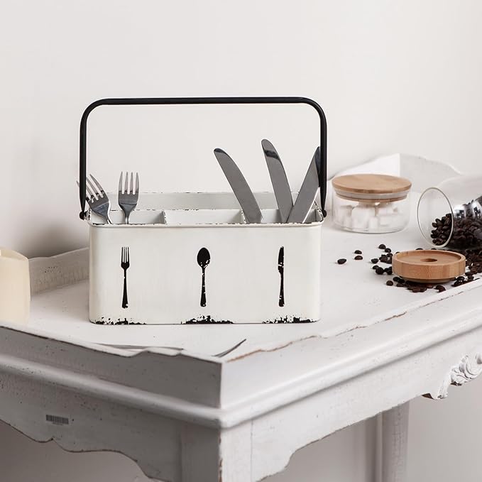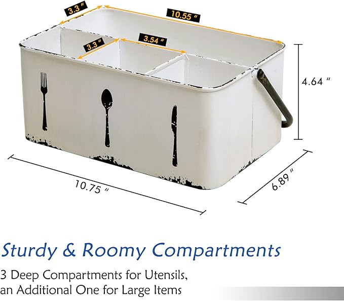 NIKKY HOME Utensil Caddy, Farmhouse Rustic Metal Cutlery Silverware Caddy with 4 Compartments, Flatware Holder Organizer for Kitchen Countertop, Picnics, Party, Camping, Outdoor - Distressed White