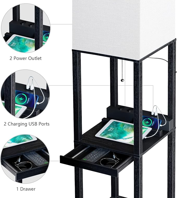 SUNMORY Floor Lamp with Shelves,Modern Dimmable Solid Wood Standing Lamp with 1 Drawer and 2 USB Ports & 2 Power Outlet,Corner Tall Bookshelf Lamp for Living Room and Bedroom(Black)