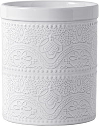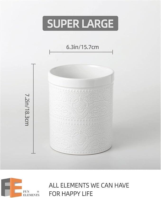 FUN ELEMENTS Kitchen Utensil Holder, 7.2" Super Large Utensil Crock Heavy and Stable Lace Emboss Ceramic Utensil Holder for Kitchen Counter (Bright White)