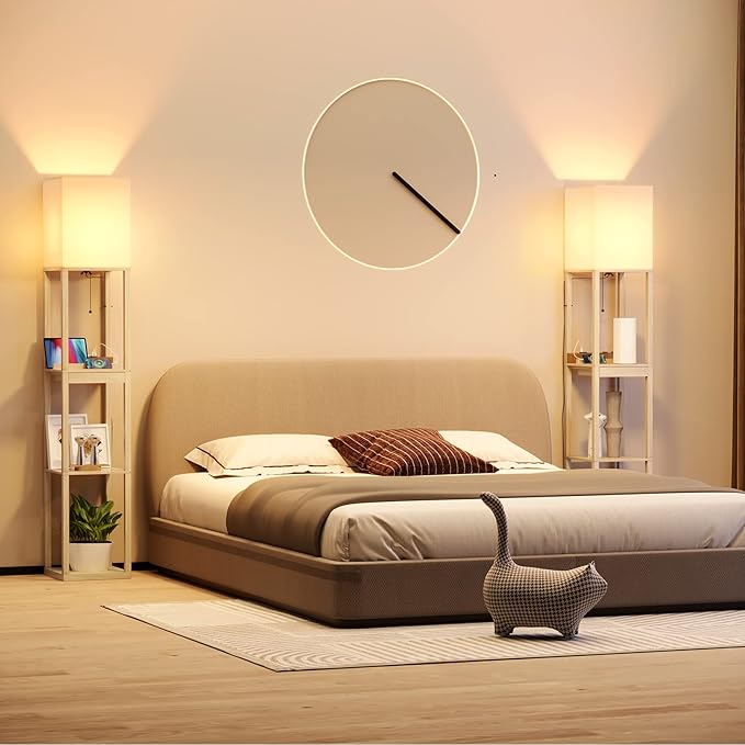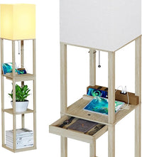 SUNMORY Floor Lamp with Shelves,Modern Dimmable Wood Standing Lamp with 1 Drawer and 2 USB Ports & 2 Power Outlet,Corner Tall Bookshelf Lamp for Living Room and Bedroom(Wood Color)