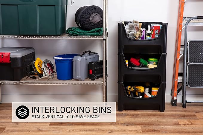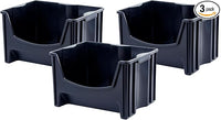 Mighty Tuff Jumbo Stackable Storage Bins, Pack of 3, Easy-Access Storage, Large Easy-To-Grip Handles, Wide Front Opening, Interlocking, Stack Vertically, Black