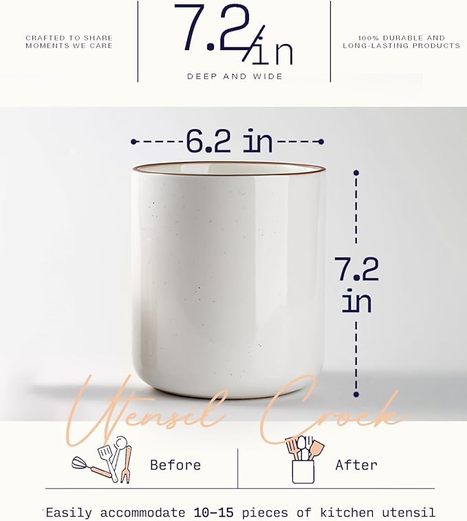 getstar Kitchen Utensil Holder, Large Ceramic Cooking Utensil Holder (H7.2” x W6.2”) for Kitchen Counter with Cork Mat at Bottom, Farmhouse Decor