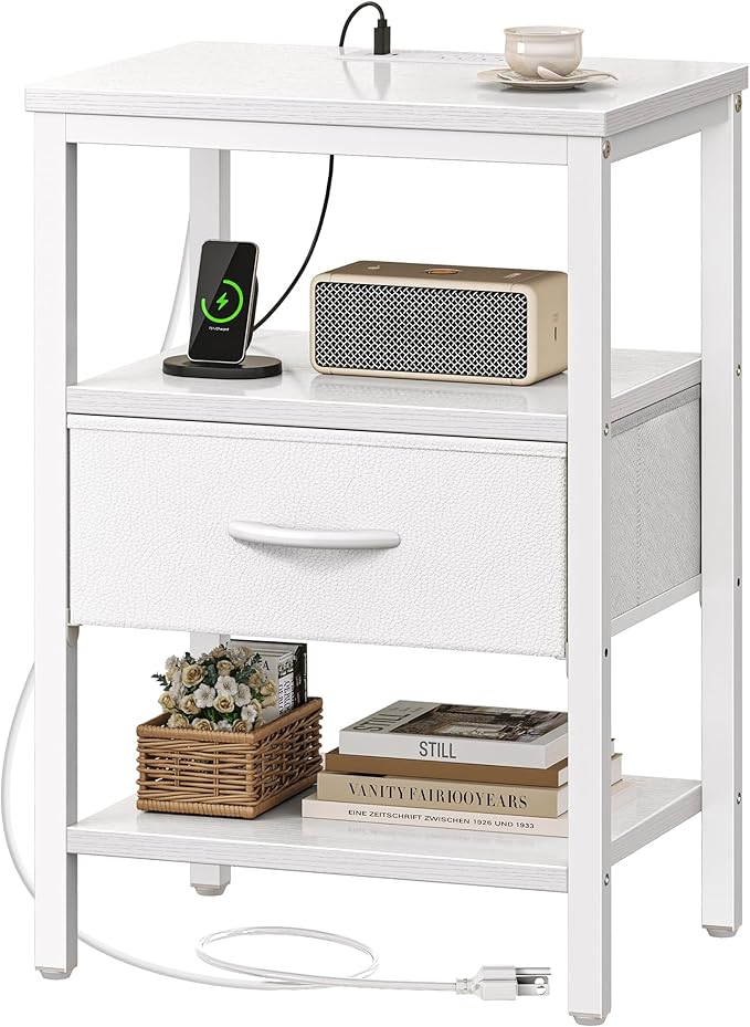 SUPERJARE Nightstand with Charging Station, Bed Side Table with Adjustable Fabric Drawer, Night Stand for Bedroom, 3-Tier Storage End Table, for Living Room, White