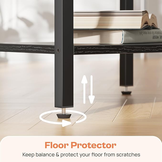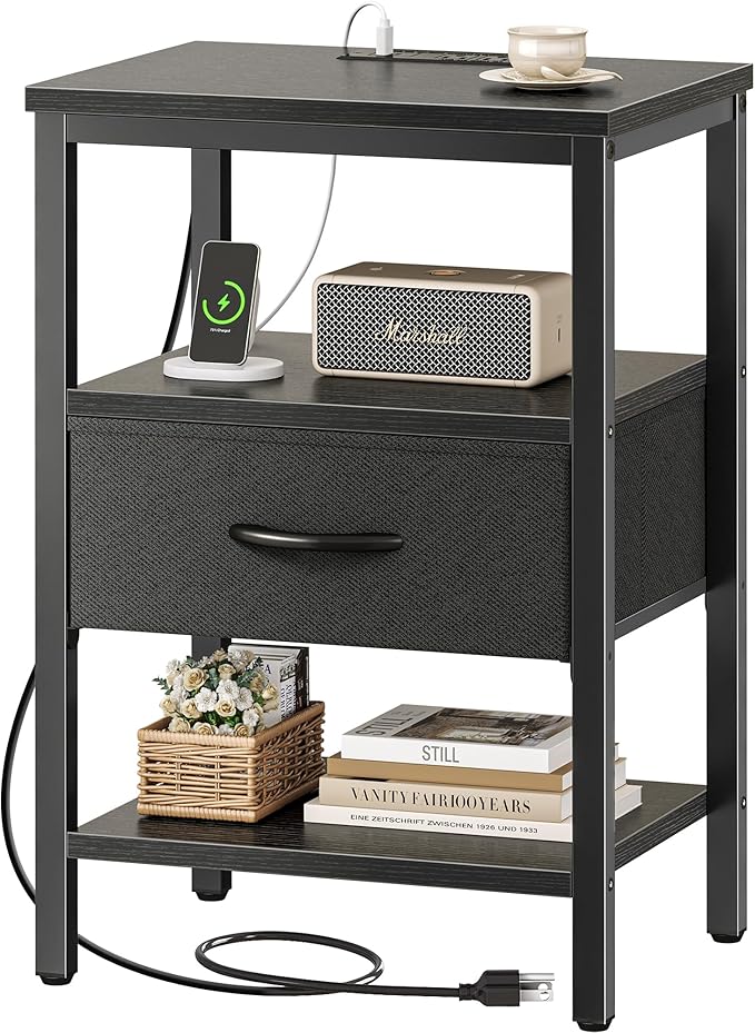SUPERJARE Nightstand with Charging Station, Bed Side Table with Adjustable Fabric Drawer, Night Stand for Bedroom, 3-Tier Storage End Table, for Living Room, Black