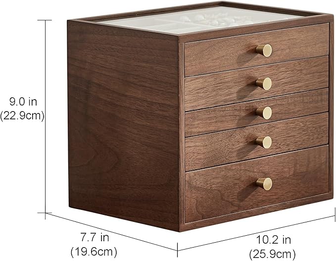Black Walnut Wooden Jewelry Box Women large 5 Layer Drawer Wood Organizer Box with Glass Lid for Necklaces, Watch, Necklace, Ring, Earring Storage - Gifts