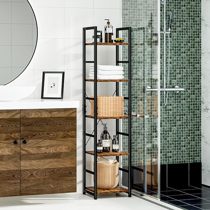 NUMENN 5 Tier Slim Bookshelf, Tall Bookcase Shelf Storage Organizer, Modern Book Shelf for Bedroom, Living Room and Home Office, Vintage
