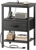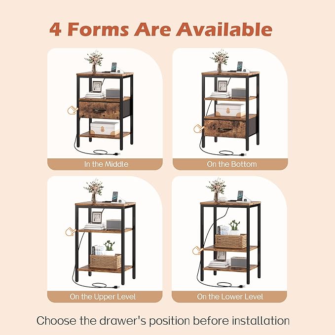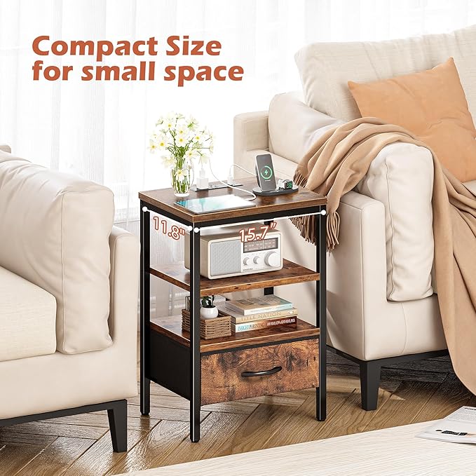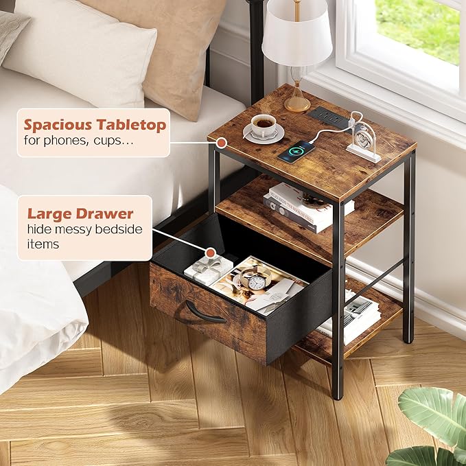 SUPERJARE Nightstand with Charging Station, Bed Side Table with Adjustable Fabric Drawer, Night Stand for Bedroom, 3-Tier Storage End Table, for Living Room, Rustic Brown
