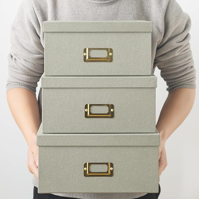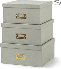 Soul & Lane Gray Kraft Paper Boxes for Storage, Set of 3 Square Stacking Boxes with Lids and Gold Label Holders, Decorative Cardboard Photo Storage for Decor and Organizing