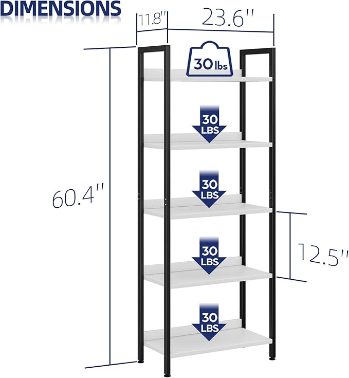 NUMENN Bookshelf, 5 Tier Bookshelves, Home Office Bookcase Shelf Storage Organizer, Free Standing Storage Shelving Unit for Bedroom, Living Room and Home Office, White&Black