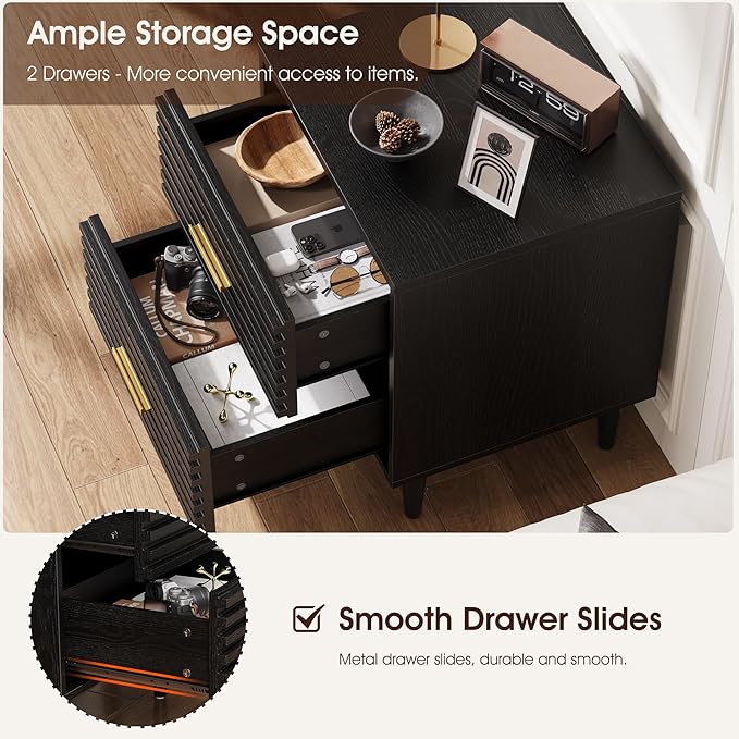 Alohappy Fluted Nightstands Set of 2, Mid Century Bedside Table for Bedroom, End Table with 2 Drawers, Modern Bed Side Table with Storage Vintage Wood Accent Table for Living Room, Black 2pcs