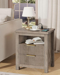Fluted Nightstand, End Table with Charging Station and 2 Drawers, Farmhouse Nightstands with Fluted Panel, Engineered Wood Side Table for Bedroom Greige MBZ06UFH