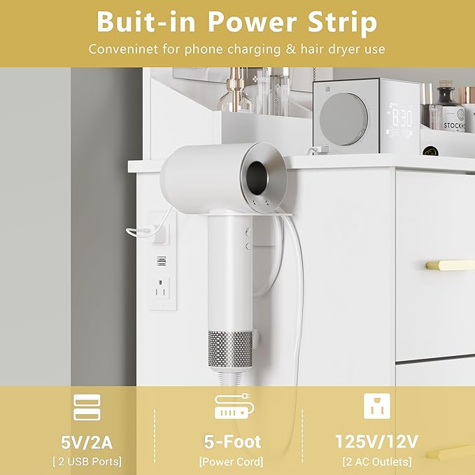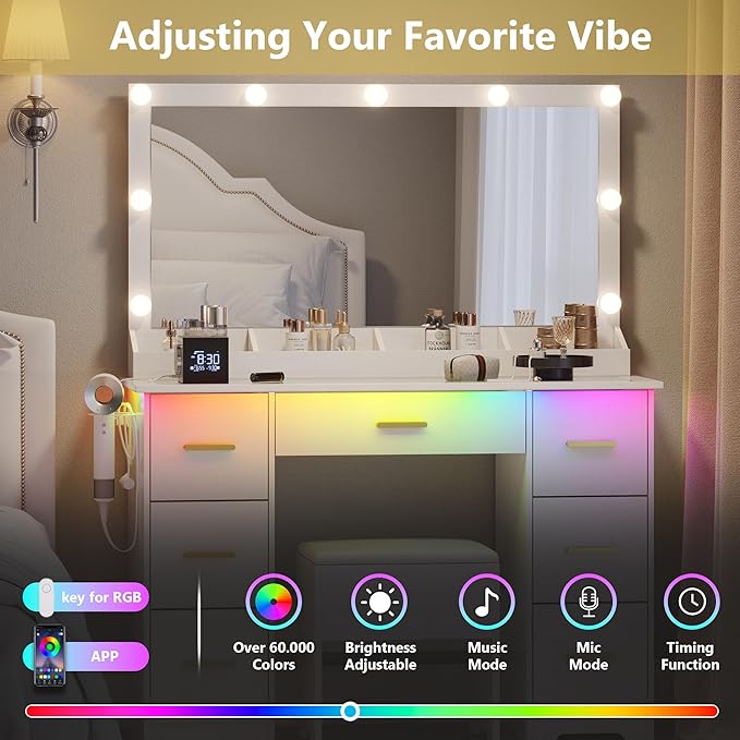 Makeup Vanity with Large Lighted Mirror and Chair, 7 Drawers Vanity Makeup Desk Table with Power Strip, Adjustable Lighting, and Cushioned Storage Stool for Women, Girls